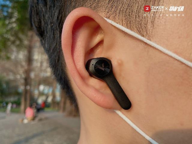 耳機雖然看著比較大,但拿在手心非常輕,大概是使用塑料材質(zhì)的緣故。入耳的部分比較小,硅膠耳塞也是比較柔軟親膚的質(zhì)地。配戴在耳朵上能夠感覺耳機稍有點大會比較有存在感,不過它卡在耳朵上的角度很合理,佩戴是很牢固的,不會因為運動等原因輕易脫落。