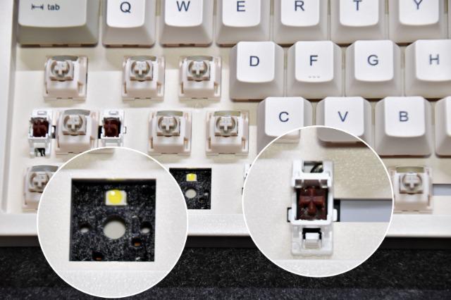 鍵盤使用了單一的白色 LED 燈珠,能通過(guò)組合鍵調(diào)節(jié)背光亮度和燈效切換,一共支持 14 種燈效變化。