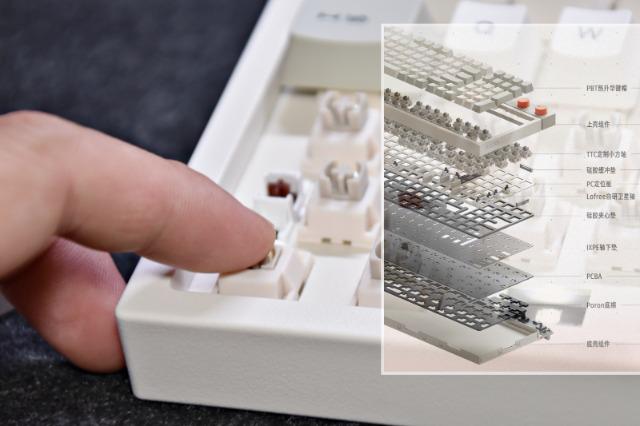 PC 定位板下面還采用了 Poron 底綿、硅膠夾心墊,相互協(xié)助,在按壓軸體的過(guò)程中,能消除大部分空腔音,降低敲擊聲噪音,實(shí)現(xiàn)清脆、軟彈的打字體驗(yàn)。