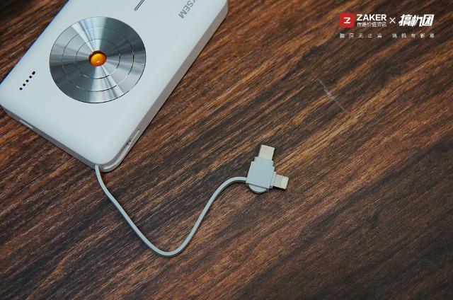 西圣PB無線充電寶的主機與數(shù)據(jù)線采用一體式設(shè)計,同時具備Lightning插頭和Type-C插頭,采用十字形設(shè)計,用的時候只能用其中一個,平時收納在槽位中,就形成了一個提手,很方便的設(shè)計。